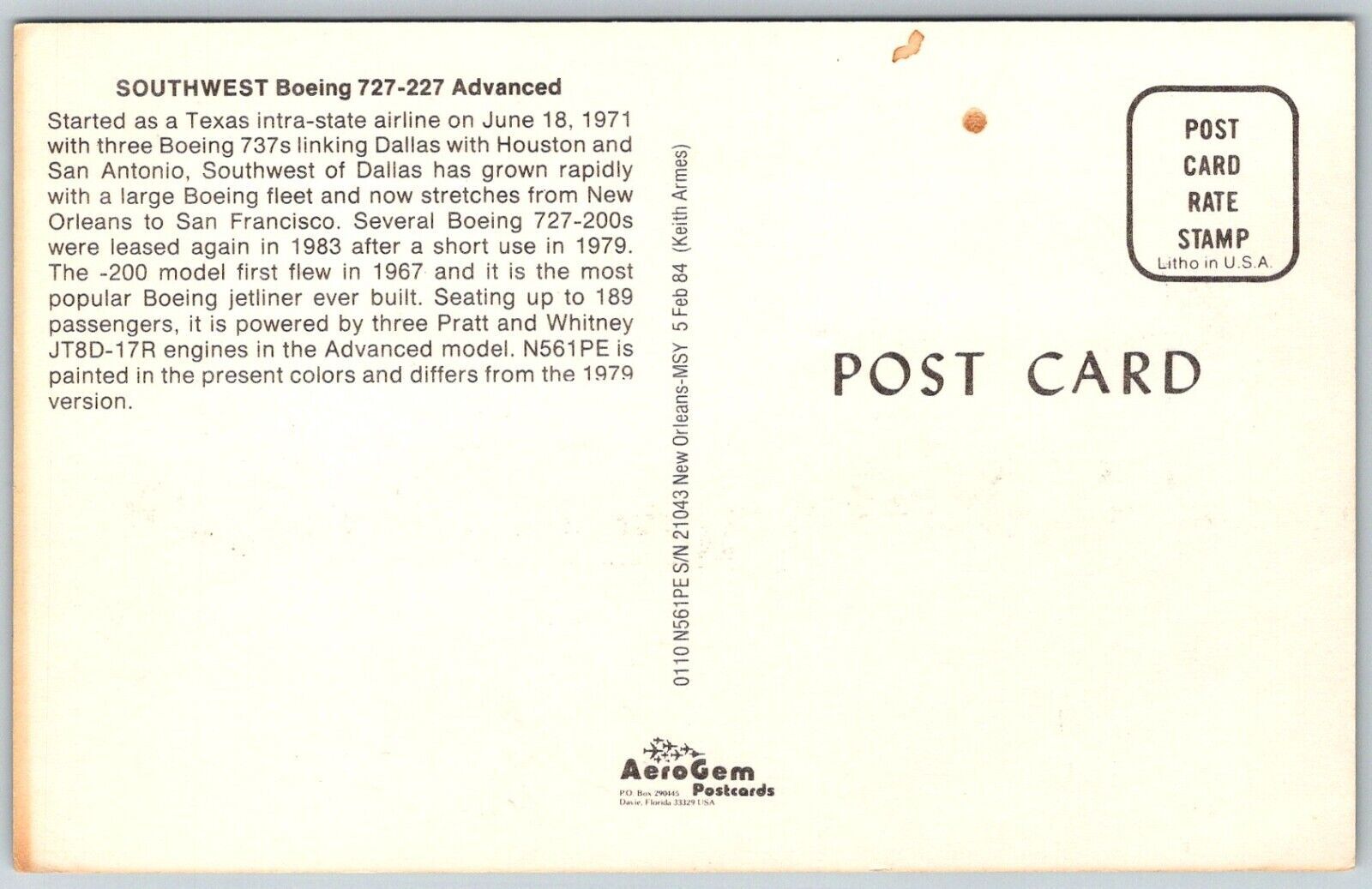 Southwest Airlines Boeing 727-227 1980s Postcard