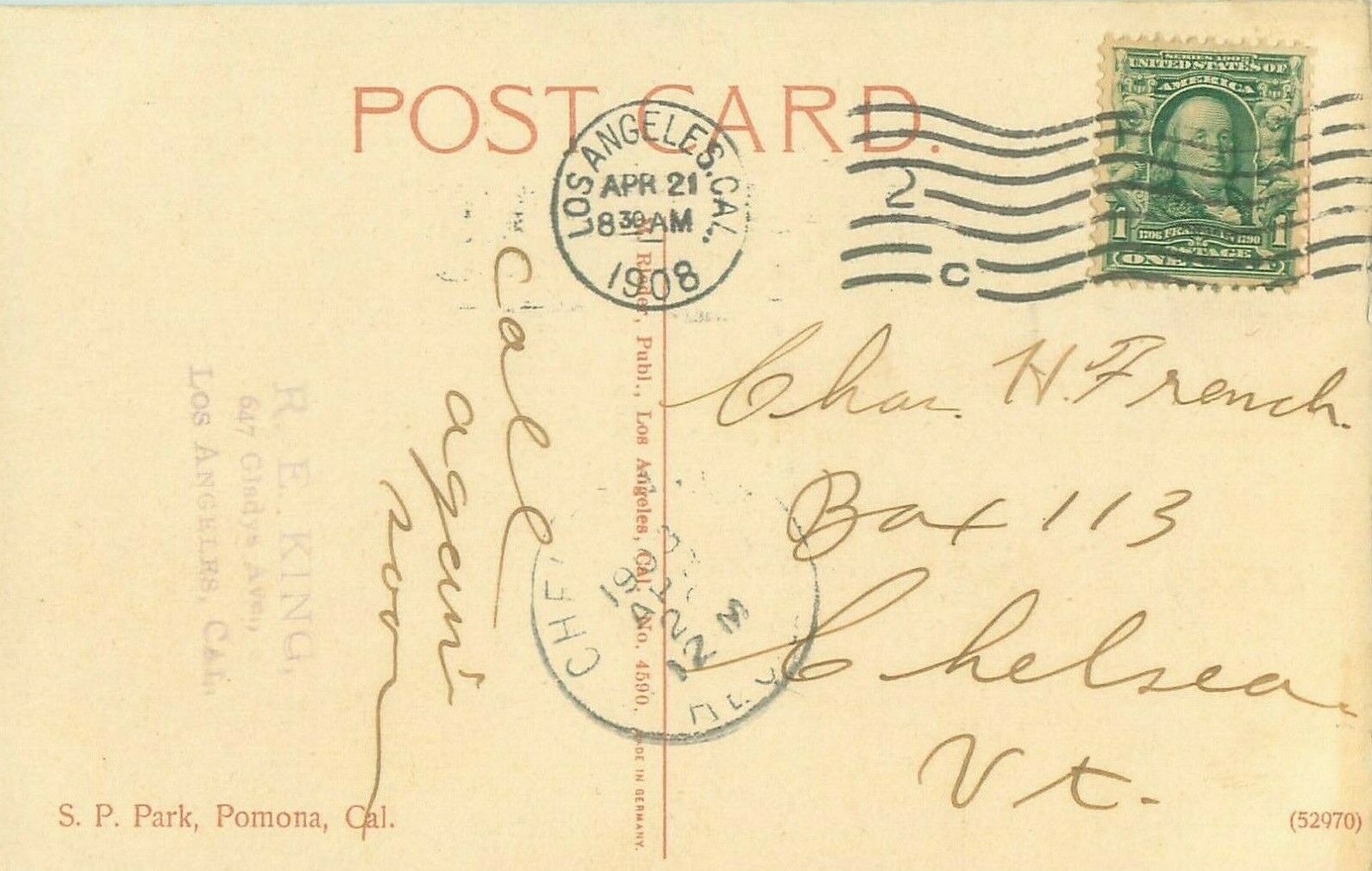 Condition:No major flaws. Notation in ink on the front. Please see photos.DESCRIPTION: SP Park iin Pomona California. Postmarked 1908.