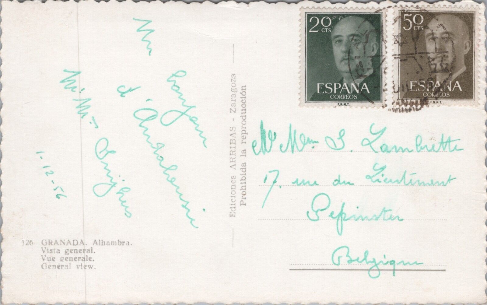 This vintage real photo postcard depicts a beautiful general view of the Alhambra in Granada, Spain. The postcard is an original and has been posted, with a standard size of 5.5 x 3.5 inches. The image captures the stunning architecture of the Alhambra, and the postcard is in great condition, ready for display or collection. The postcard features a single unit and is an excellent addition to any collection of topographical postcards, postcards, or general collectibles. The photo is an authentic representation of the Alhambra, with no alterations or modifications, and is an ideal choice for those interested in Spain, cities, and towns, or European history.Look close at the pictures for the quality of the postcards and use the Hip zoom to examine the front and back. Lines are from the scanner and are not on the postcardIf you Buy More items please wait before you pay! I will sent you an invoice to combine shipping discount!!!1 postcard Shipping Worldwide $2.00 and after that 50 cents extre for each card. So for example: You buy 3 cards shipping will cost you $2.00 plus $1.00 is $3.00 dollars.I will Ship in a plastic Postcard Sleeve for protection.