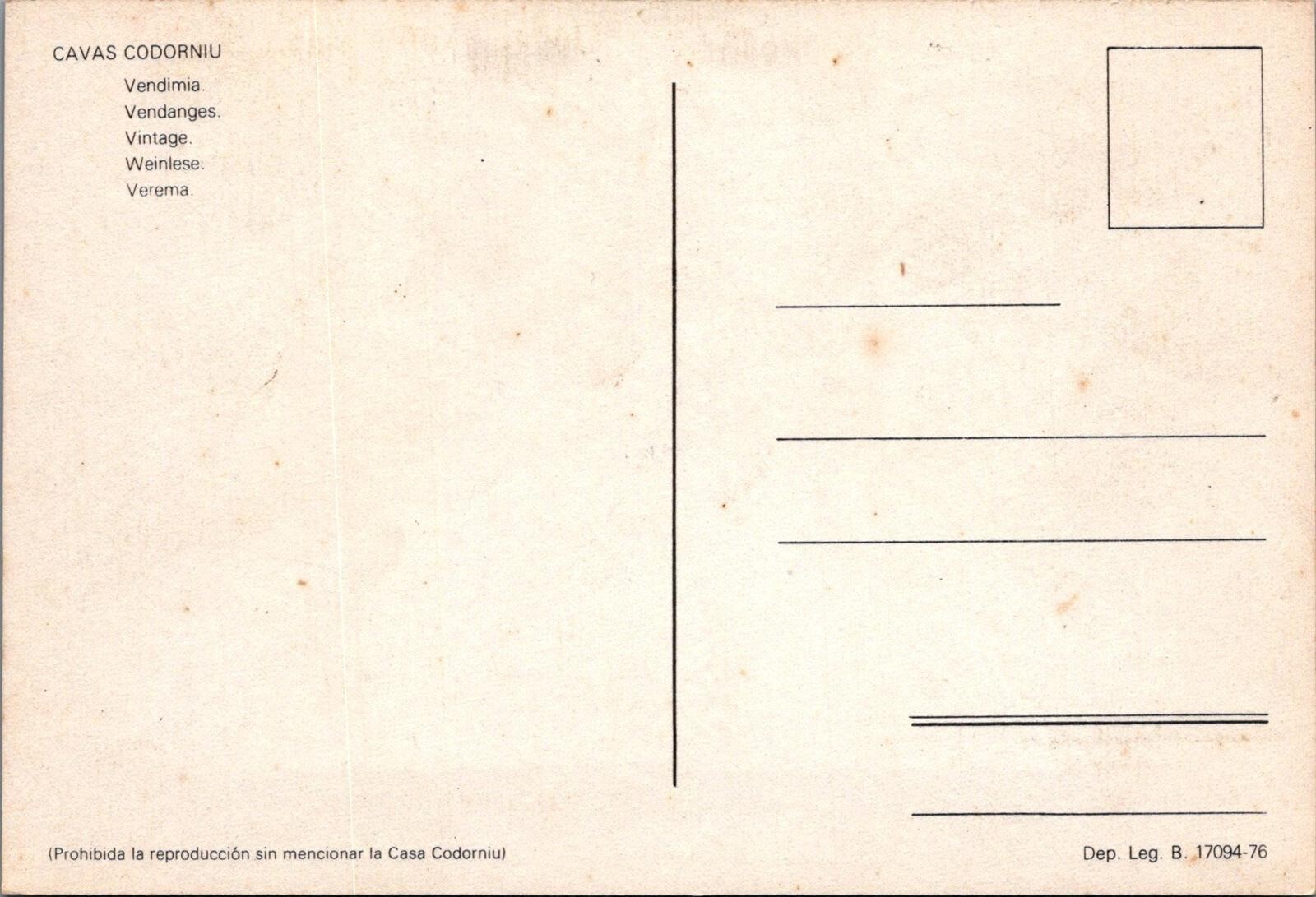 Spain Postcard - Cavas Codorniu, Vintage, Picking Grapes RR23373Publisher: Postcard size: Non standard. This postcard measures 99mm x 146mmPostcard defect(s): Please also use the image magnifier to make your own ass ... Read More