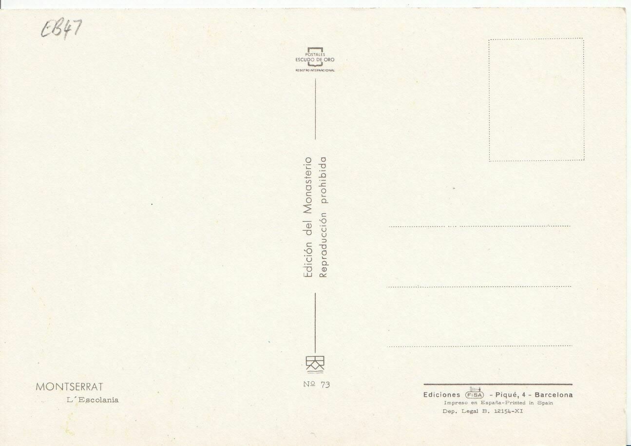Mo's Postcards Title: Spain Postcard - Montserrat - L'Escolania Publisher: As seen in the scanned image Postally Used: Unused Defect(s): Postage & Payment: For U.K residents the quoted P & P fee is for any number of ... Read More