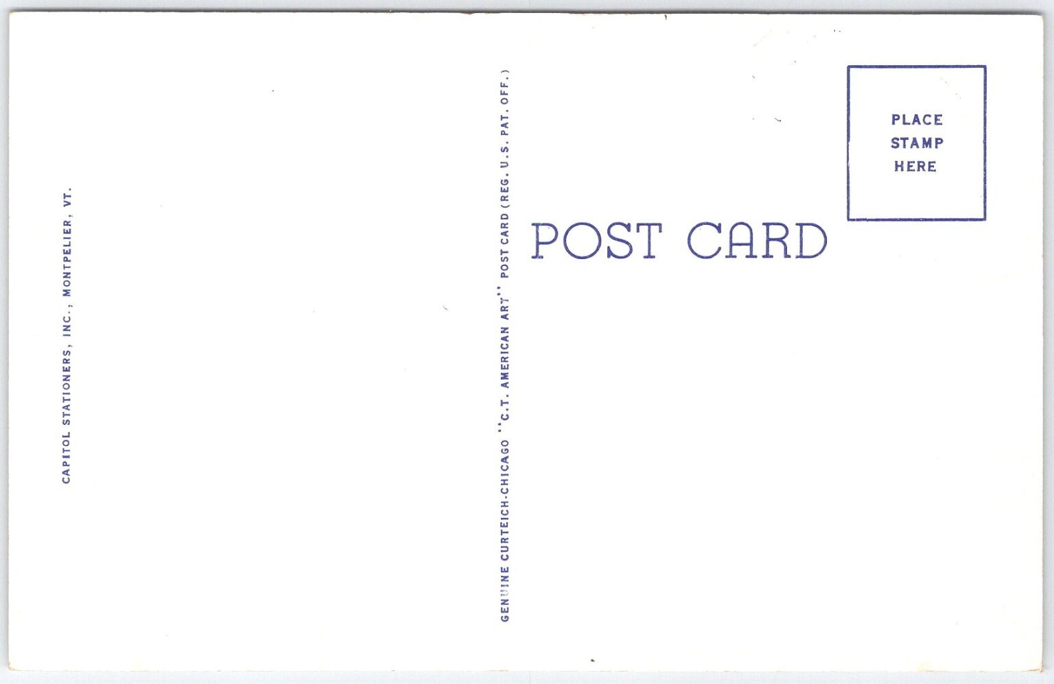 Discover a vibrant vintage postcard showcasing the historic Spaulding High School and the distinguished Robert Burns Monument in Barre, Vermont. This beautifully rendered card captures the stately red brick architecture of the school, framed by lush green trees, creating a picturesque scene of educational heritage and civic pride. The detailed depiction of the Robert Burns statue stands prominently in the foreground, honoring the celebrated poet.This collectible piece, produced by the renowned Curteich-Chicago under their "C.T. American Art" line, likely dates from the mid-20th century. The printing technique provides a rich, colorized view, characteristic of postcards from that era, making it a wonderful addition for collectors of Vermont memorabilia, educational history, or architectural postcards. It offers a nostalgic glimpse into Barre's past, highlighting a significant local landmark and a tribute to a literary icon.