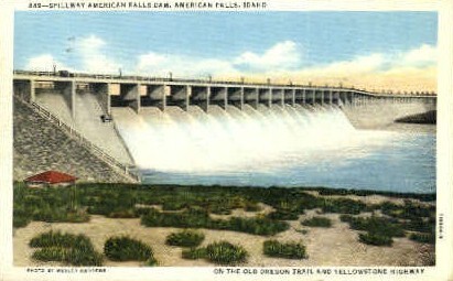 Spillway American Falls Dam - Idaho ID Postcard - 1945 Grade: 3 Size: R - Regular size: Approx 3 1/2 X 5 1/2 inch (9 cm X 14 cm) Grading Scale: Grade 1 = Perfect corners Grade 2 = Very Minimal corner wear, no ... Read More