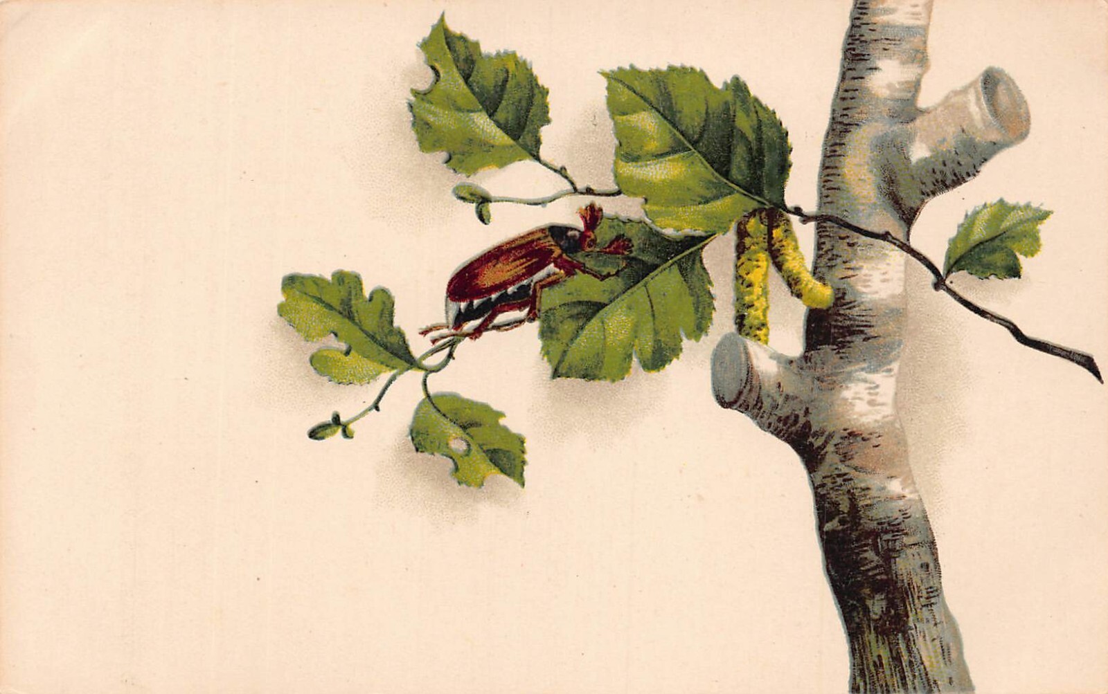 Spring Greetings Leaf Maybug Insect Tree Birch vintage postcard C316