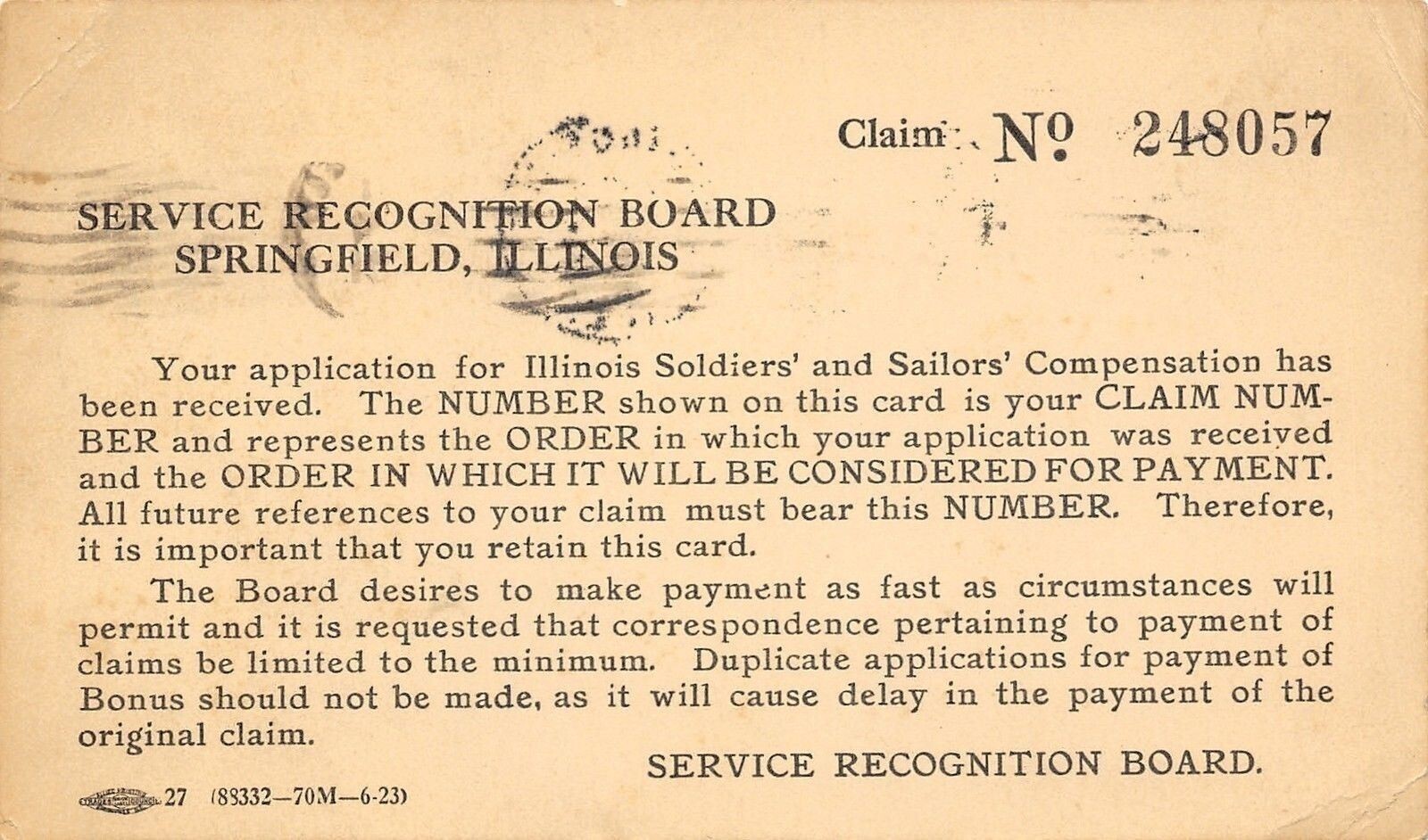 Springfield IL~WWI Service Recognition Board~Soldier Sailor Compensation~1923