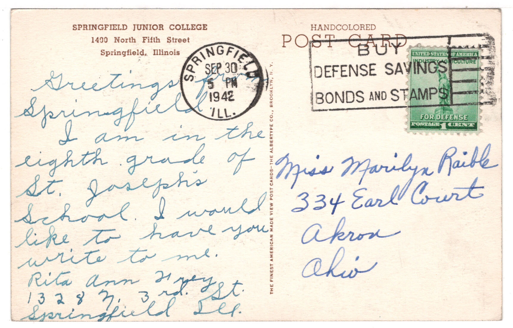 Postcards are shown from Actual Scan - Post Marked September 30, 1942 - In Very Good Condition.Seller Information