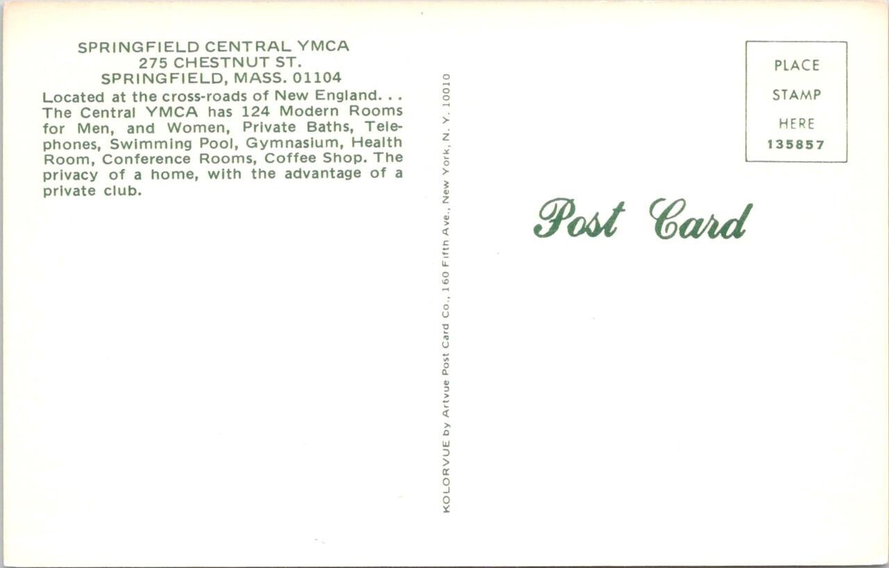 Springfield, MA Massachusetts CENTRAL YMCA BUILDING Vintage Chrome Postcard Springfield, MA Massachusetts CENTRAL YMCA BUILDING Vintage Chrome Postcard Click images to enlarge Description Please don't hesitate to send me a question, before or after your purchase. I want to make sure your experience is a positive one and will respond promptly to all inquiries. I offer a full refund if you are unhappy with your purchase, so please buy with confidence. Please Add me to your Favorite Sellers and Visit My Hip Store frequently, as new items are added every week. Pictures sell!Auctiva offers Free Image Hosting and Editing.300+ Listing Templates!Auctiva gets you noticed!The complete Hip Selling Solution.Track Page Views WithAuctiva's Counter