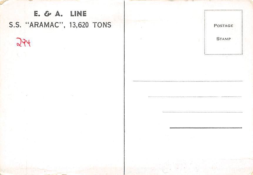 SS Aramac E & A Line Ship Postcard Unused, Grade: 3 Size: Continental Size Postcard - approximately 4 inch X 6 inch (15 CM X 10.5 CM) Grading Scale: Grade 1 = Perfect corners Grade 2 = Very Minimal corner wear, ... Read More