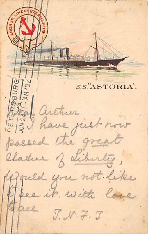 SS Astoria Allan Line Ship Postcard 1902, Grade: 4 - writing on front, postal marking on front side, stains on front and back side Size: Regular Size Postcard - approximately 3 1/2 inch x 5 1/2 inch (9 CM x 14 CM) ... Read More