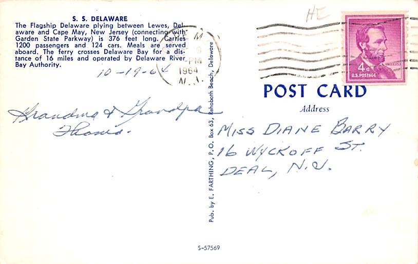 SS Delaware Ferry Boats Ship Postcard 1964, Grade: 1 Size: Regular Size Postcard - approximately 3 1/2 inch x 5 1/2 inch (9 CM x 14 CM) Grading Scale: Grade 1 = Perfect corners Grade 2 = Very Minimal corner wea ... Read More