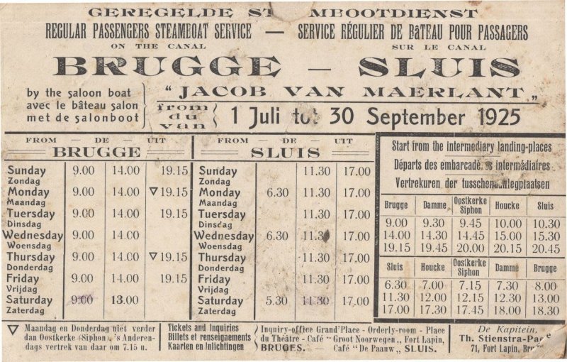 SS Jacob Ship Brugge Sluis Timetable Antique 1925 Postcard
