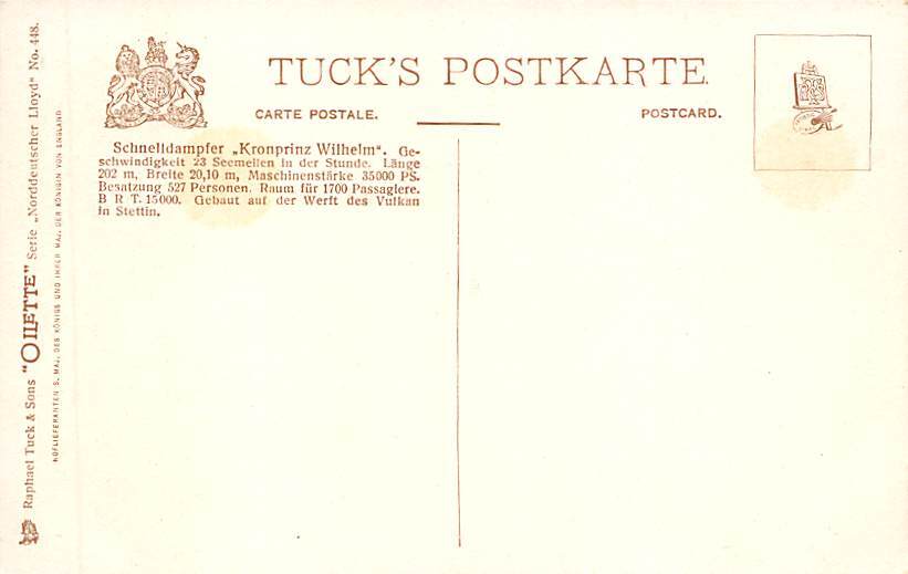 SS Kronprinz Wilhelm Norddeutscher Lloyd Ship Postcard ,