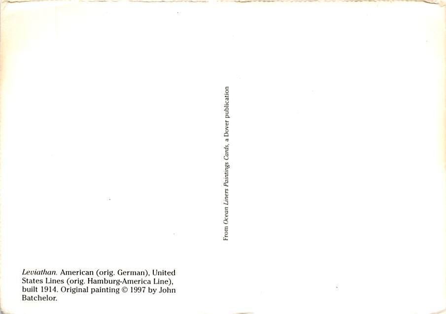 SS Leviathan United States Line Postcard Unused, Grade: 3, , Size: Continental Size Postcard - approximately 4 inch X 6 inch (15 CM X 10.5 CM) Grading Scale: Grade 1 = Perfect corners Grade 2 = Very Minimal cor ... Read More