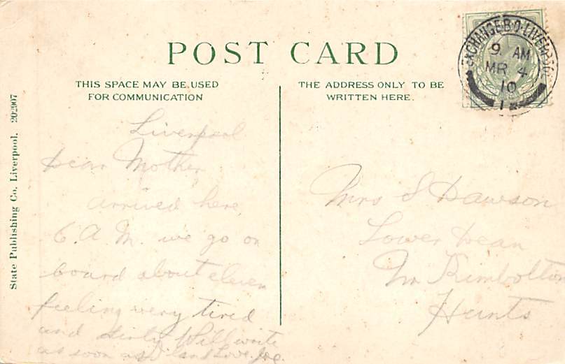 SS Virginian Allan Line Ship Postcard 1910, Grade: 3 Size: Regular Size Postcard - approximately 3 1/2 inch x 5 1/2 inch (9 CM x 14 CM) Grading Scale: Grade 1 = Perfect corners Grade 2 = Very Minimal corner wea ... Read More