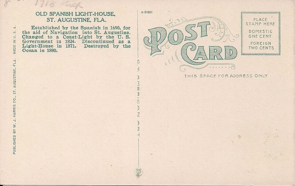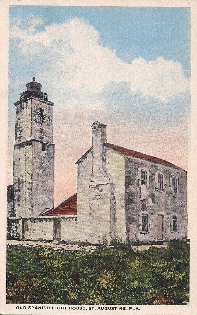 Standard size white border postcard from St. Augustine, FL, featuring a view of the old Spanish lighthouse. Ca. 1925 Curt Teich American Art series. Good to very good good condition, please see both scans