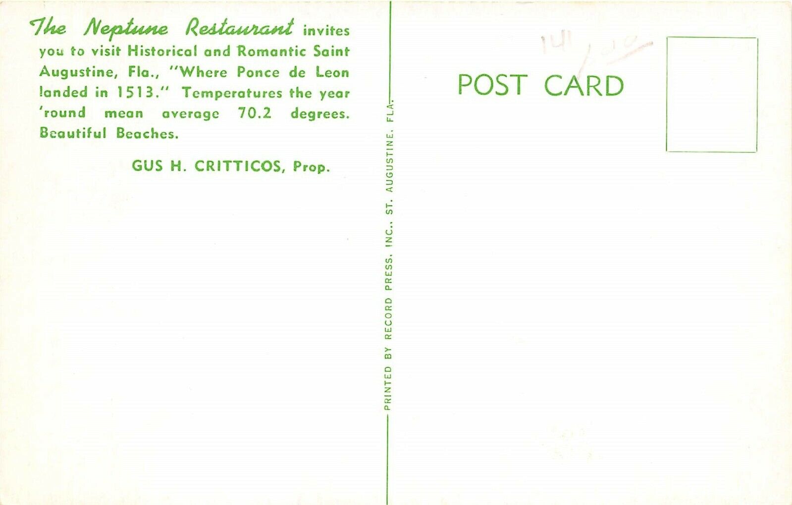 St. Augustine Florida 1950s Postcard The Neptune Restaurant