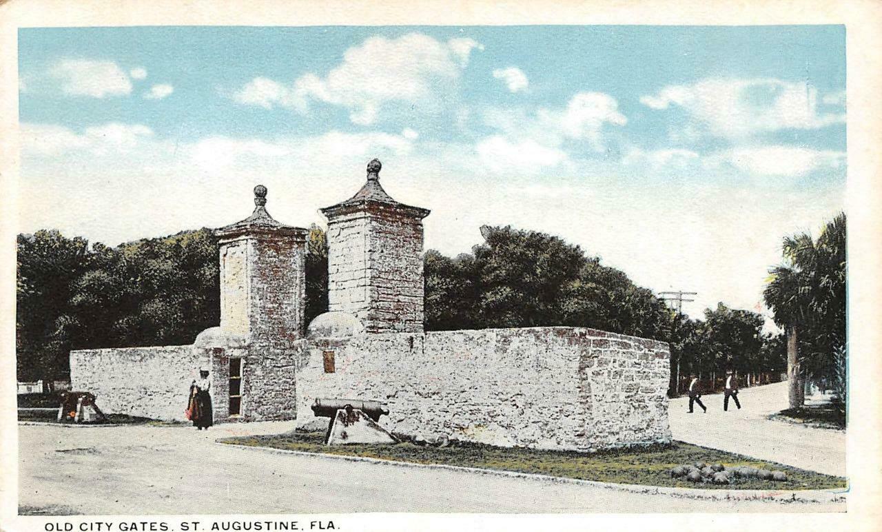 ST AUGUSTINE, Florida FL OLD CITY GATES Brick Columns~Cannon c1920's Postcard