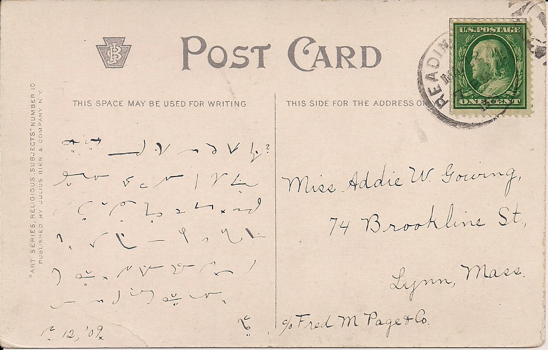 Standard size white border postcard featuring a view of St. Cecilia playing an organ with angels. Postmarked 1923. Good condition, please see both scans.