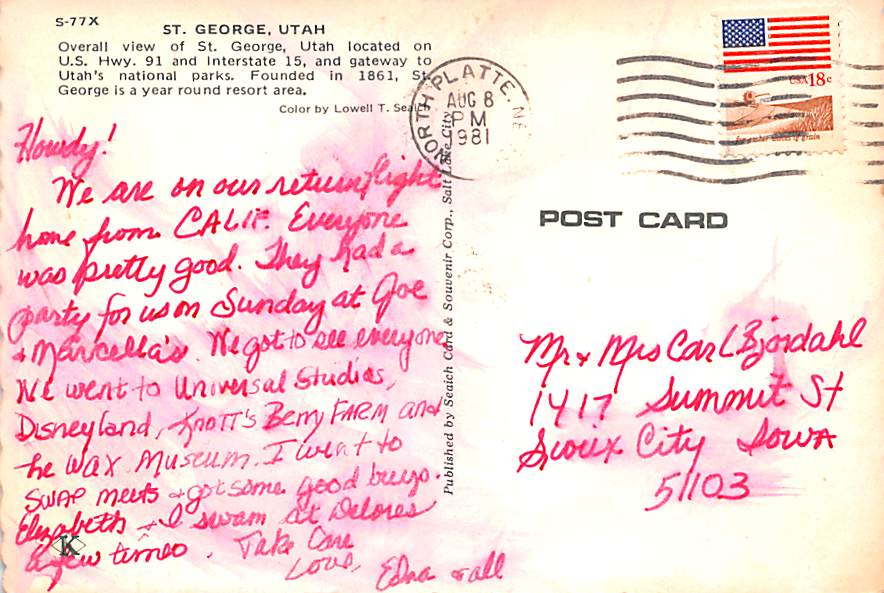 St George - Utah Grade: 3 - postal marking on front Category: Continental Size Postcard, Approx 4 in x 6 in (10 cm x 15.25 cm) Product Size: Continental size: 4X6 inches (10.5 cm x 15 cm) Grading Scale: Grade 1 ... Read More