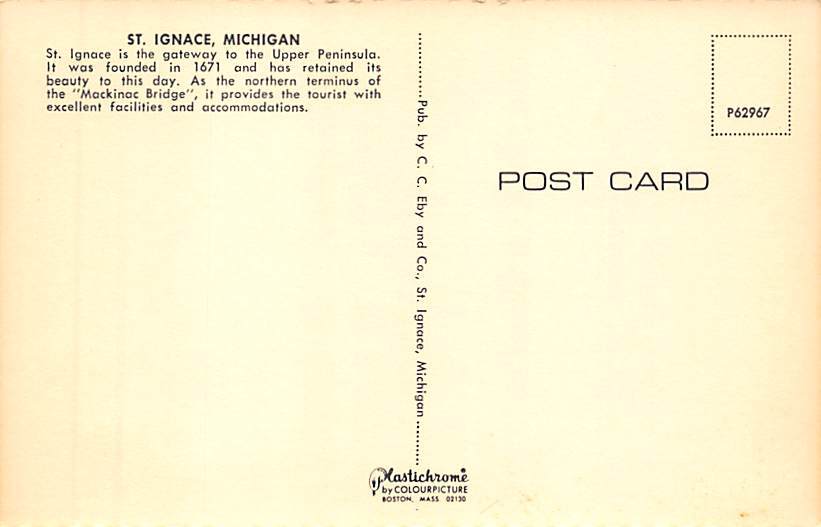 St. Ignace Gateway To The Upper Peninsula St. Ignace MI Grade: 1 Size: Regular Size Postcard - approximately 3 1/2 inch x 5 1/2 inch (9 CM x 14 CM) Grading Scale: Grade 1 = Perfect corners Grade 2 = Very Minima ... Read More