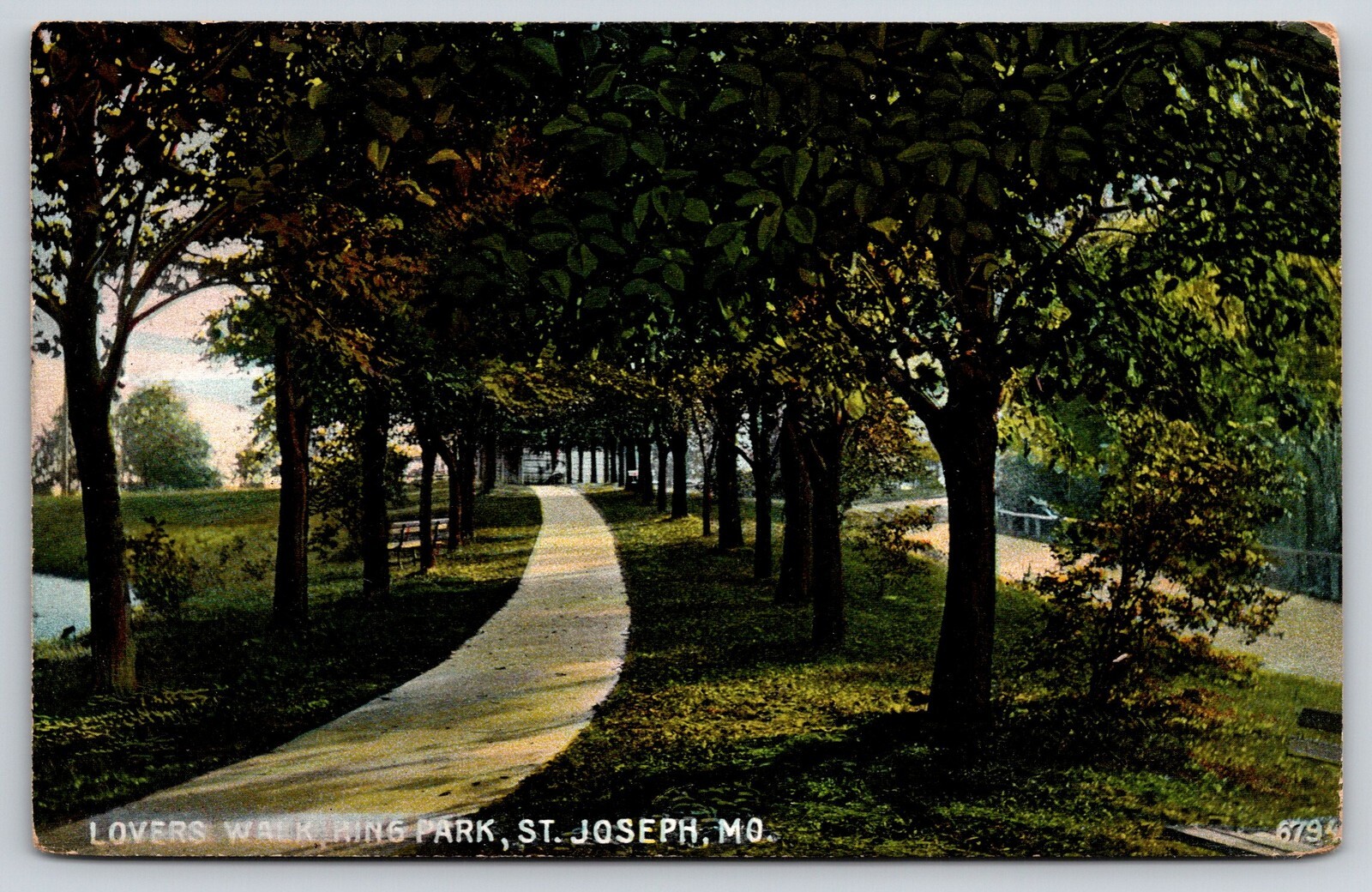 St Joseph Missouri~King Park~Lovers Walk Path View~Road~Bench~1910 Postcard