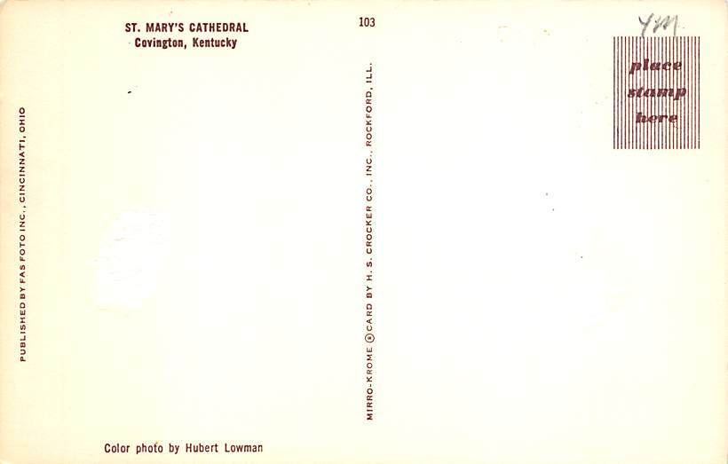 St Mary's Cathedral Covington KY Postcard - Unused Grade: 1 paper wear on back Size: R - Regular size: Approx 3 1/2 X 5 1/2 inch (9 cm X 14 cm) Grading Scale: Grade 1 = Perfect corners Grade 2 = Very Minimal c ... Read More