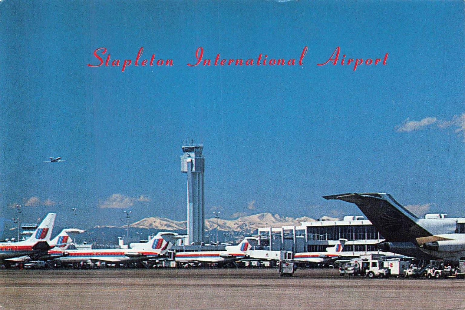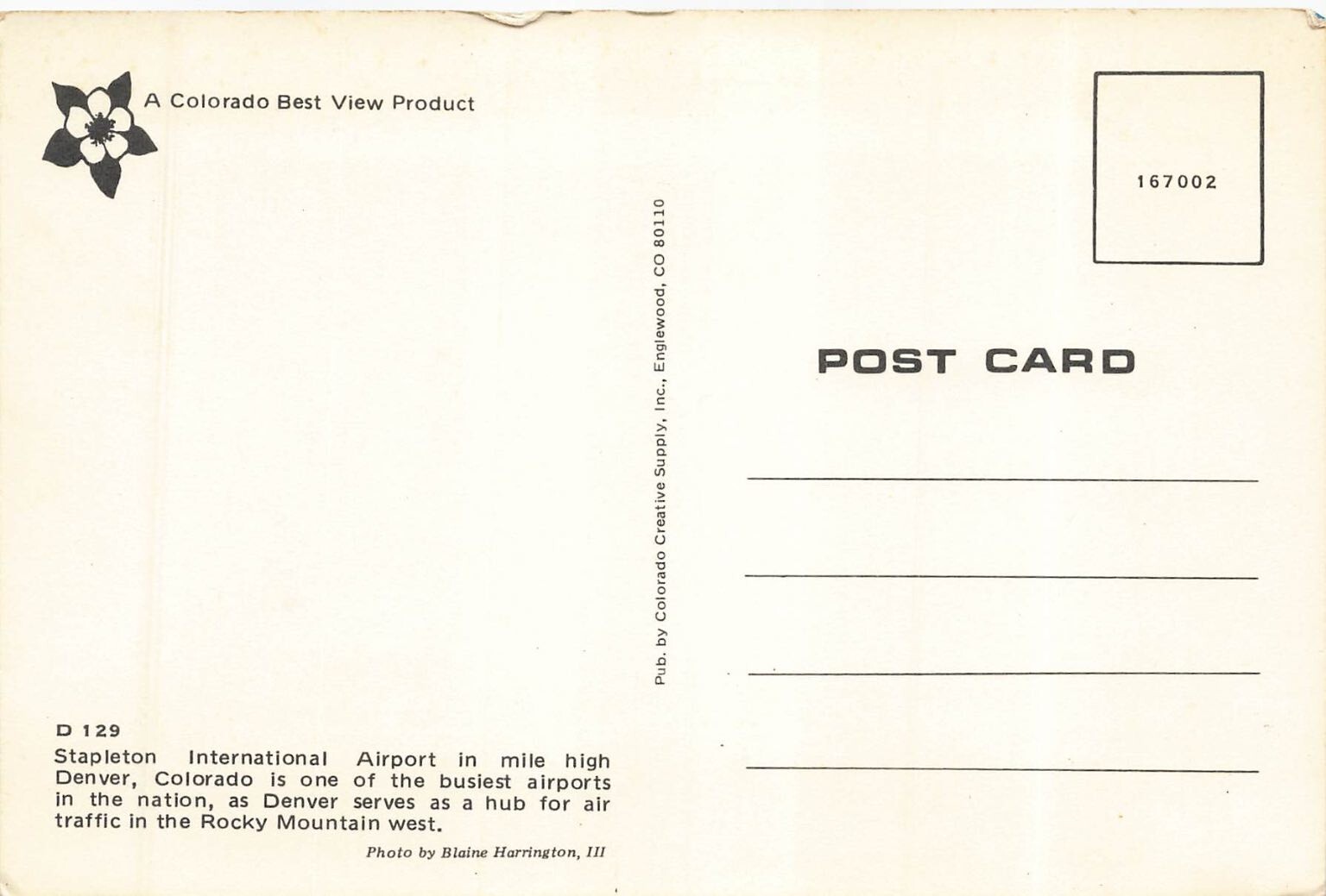 This vintage postcard showcases Stapleton International Airport, once the primary airport serving Denver, Colorado, famously known as the Mile High City. The image captures a clear day with several commercial airplanes and the iconic airport control tower set against the majestic Rocky Mountains in the background. The vibrant blue sky and detailed airport scene reflect the classic Photochrome printing technique popular from 1939 onward, known for its rich, saturated colors.Published by Colorado Creative Supply, Inc. of Englewood, Colorado, this original postcard is part of the 'Colorado Best View' series, highlighting prominent Colorado landmarks. The postcard measures a continental size of 6 x 4 inches, ideal for collectors of U.S. motels and travel memorabilia. The back provides informative text about the airport's significance as a hub in the Rocky Mountain west, accompanied by the photographer credit to Blaine Harrington, III. This collectible postcard is a wonderful piece for aviation enthusiasts and those interested in mid-20th century American travel history.
