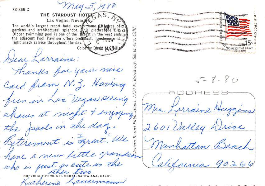 Stardust Las Vegas, Nevada Grade: 1 Size: Continental Size - approximatly 4 Inch x 6 Inch (15 cm x 10.5) Grading Scale: Grade 1 = Perfect corners Grade 2 = Very Minimal corner wear, no creases Grade 3 = Some c ... Read More