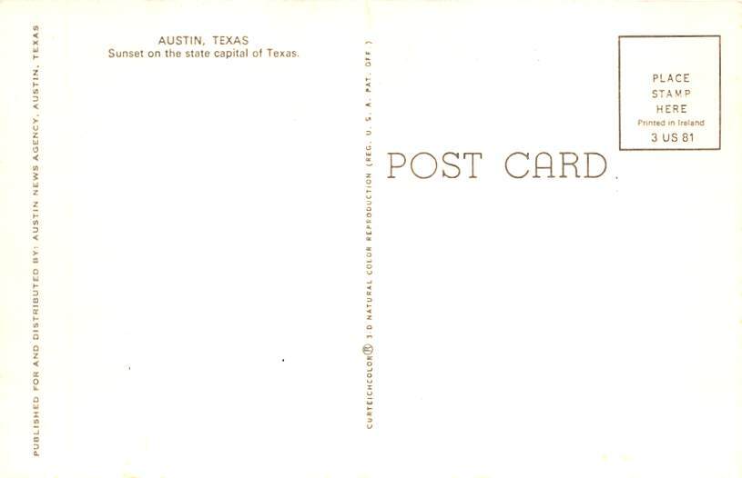 State Capital Of Texas Postal Date: View Images Grade: 1 Size: Regular Size Postcard - approximately 3 1/2 inch x 5 1/2 inch (9 CM x 14 CM) Grading Scale: Grade 1 = Perfect corners Grade 2 = Very Minimal corn ... Read More