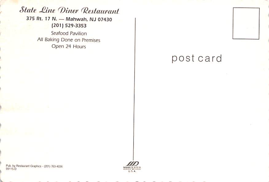 State Line Diner Restaurant - Mahwah, New Jersey Grade: 1 Category: Continental Size Postcard, Approx 4 in x 6 in (10 cm x 15.25 cm) Product Size: Continental size: 4X6 inches (10.5 cm x 15 cm) Grading Scale: ... Read More