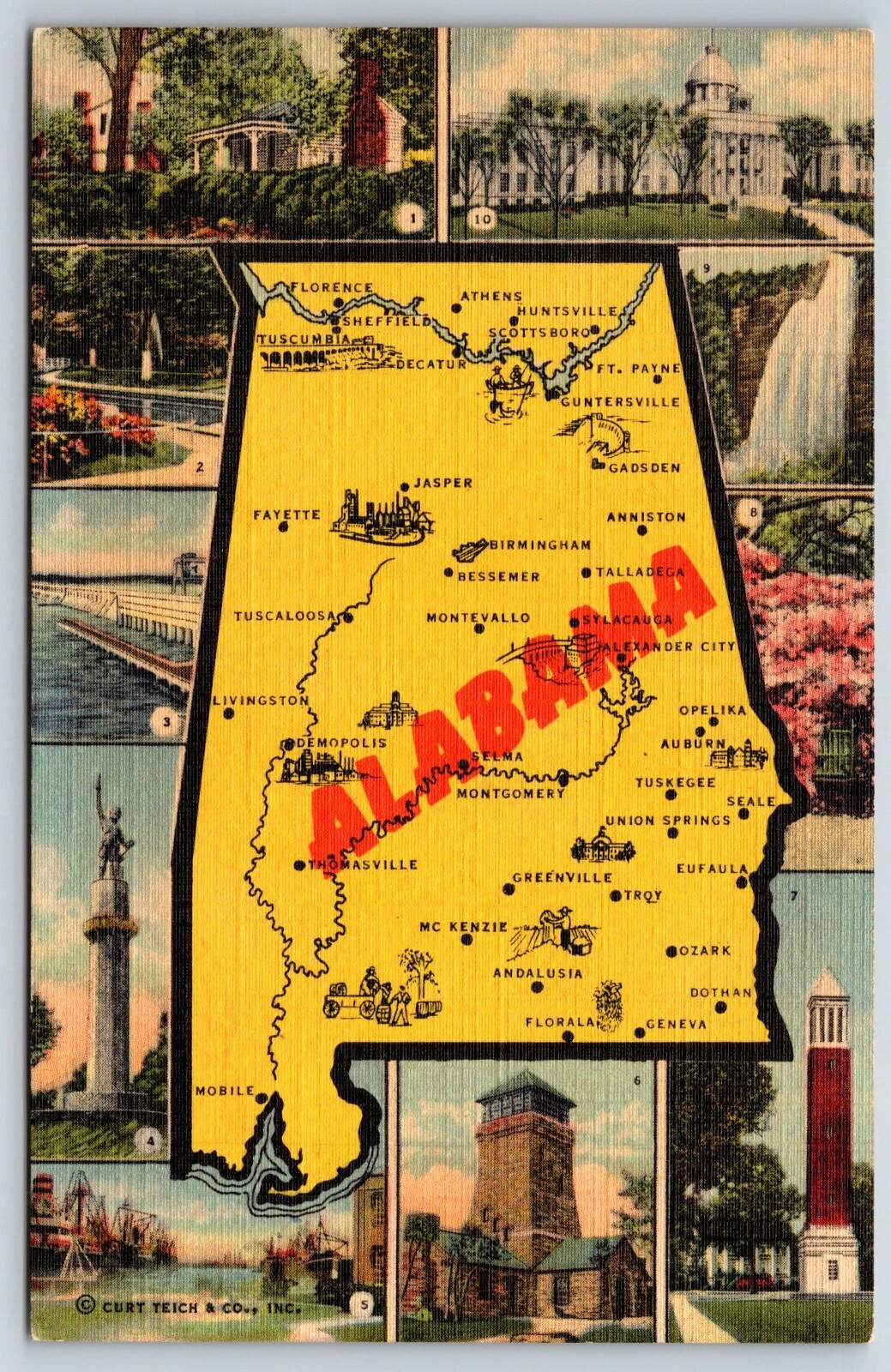 State Map~Alabama Multi-View~Selma~Montevallo~Andalusia~Jasper~Linen Postcard