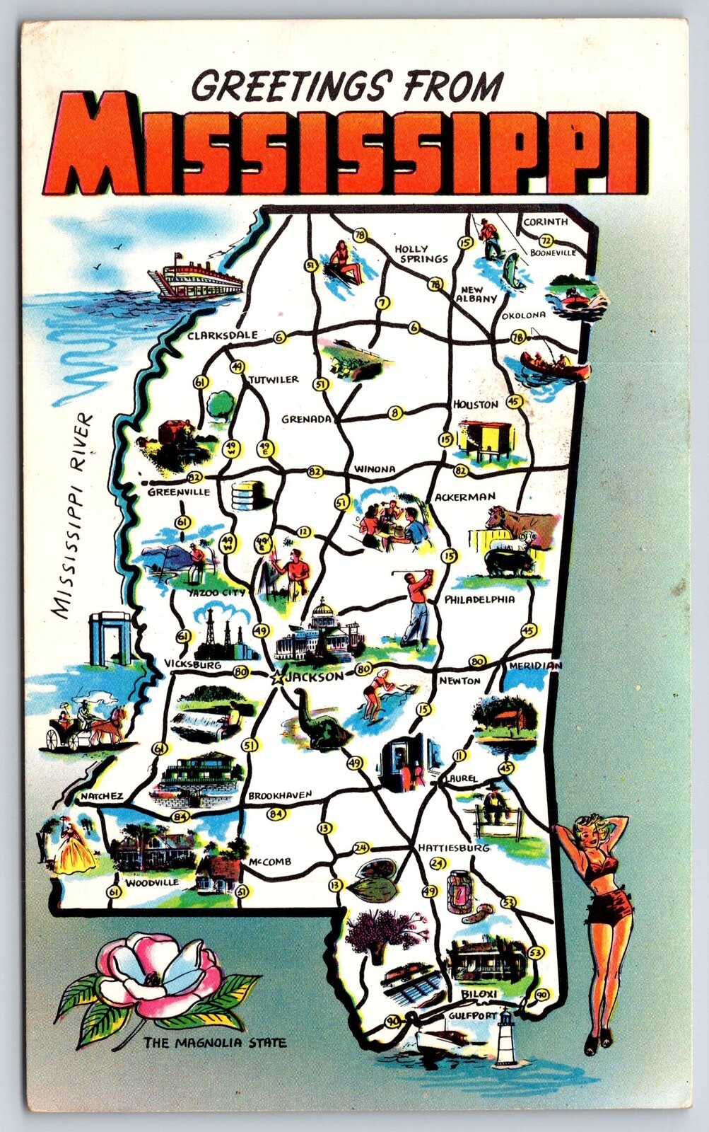 State Map~~Greetings From Mississippi~Jackson~Newton~McComb~Vintage Postcard