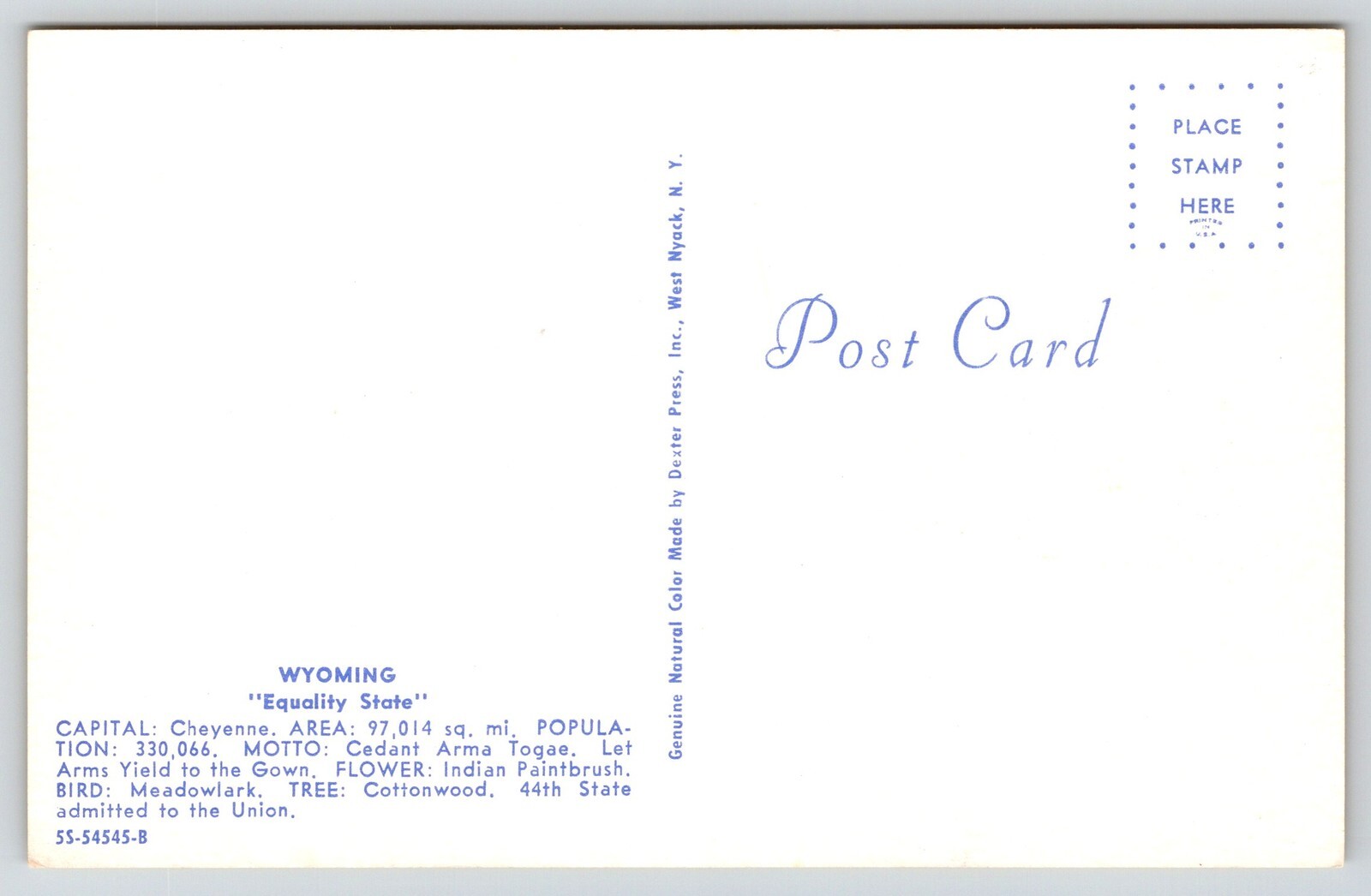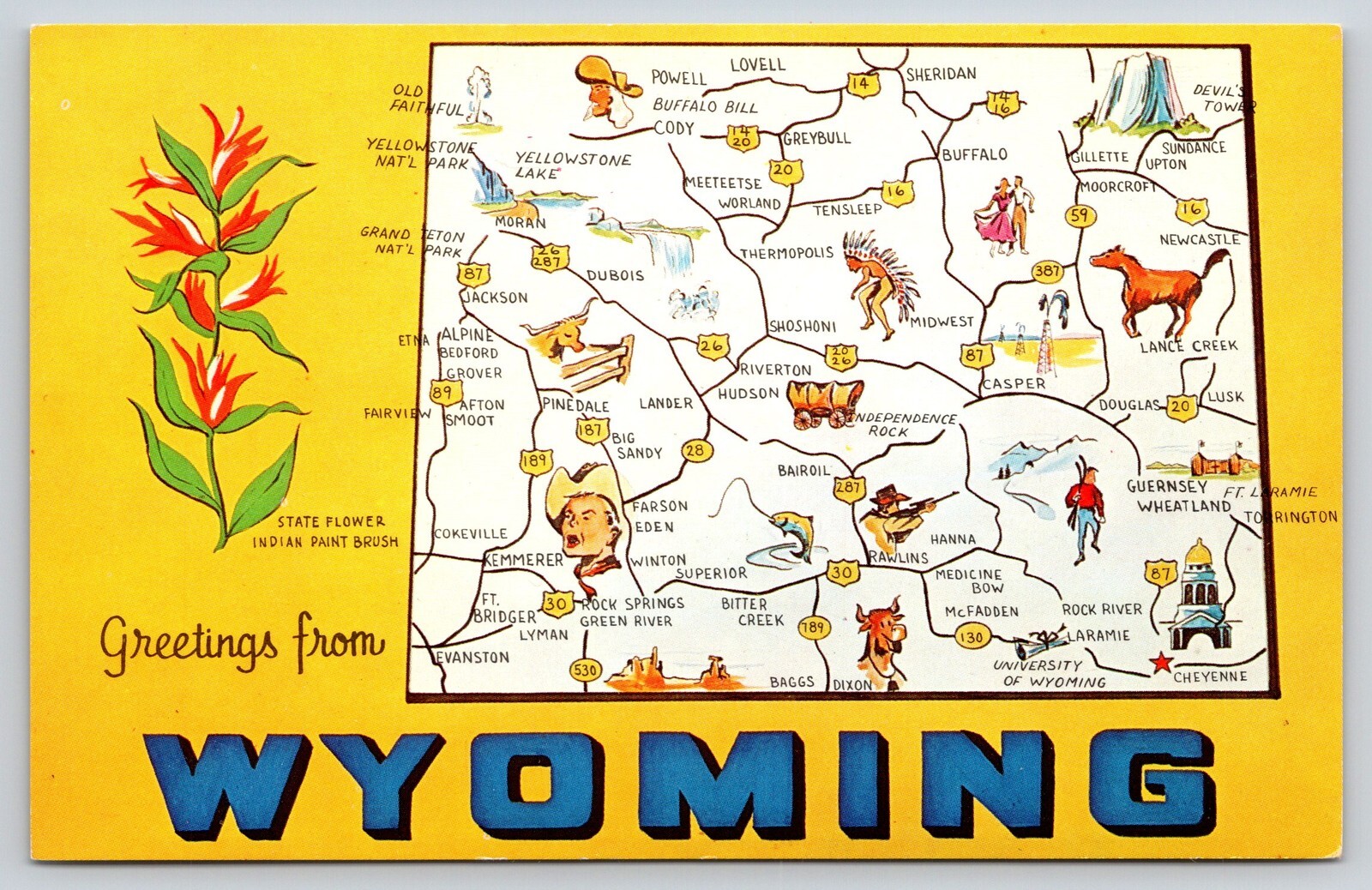 State Map~Greetings From Wyoming~Paint Brush Flower~Rawlins~Moran~1950s Postcard