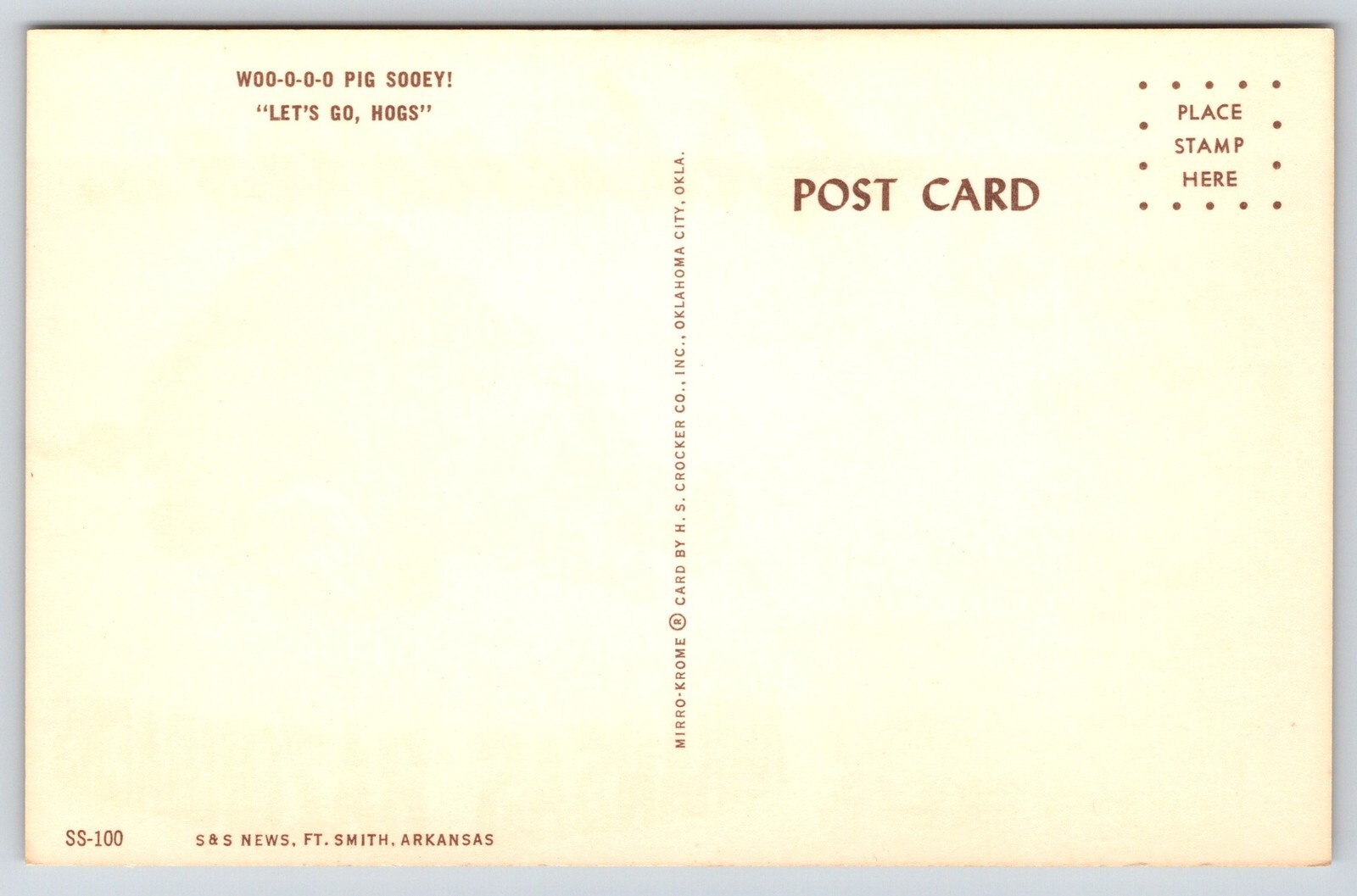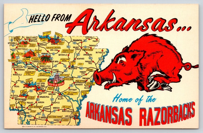 State Map~Hello From Arkansas~Razorbacks~Conway~Warren~Paragould~1950s Postcard