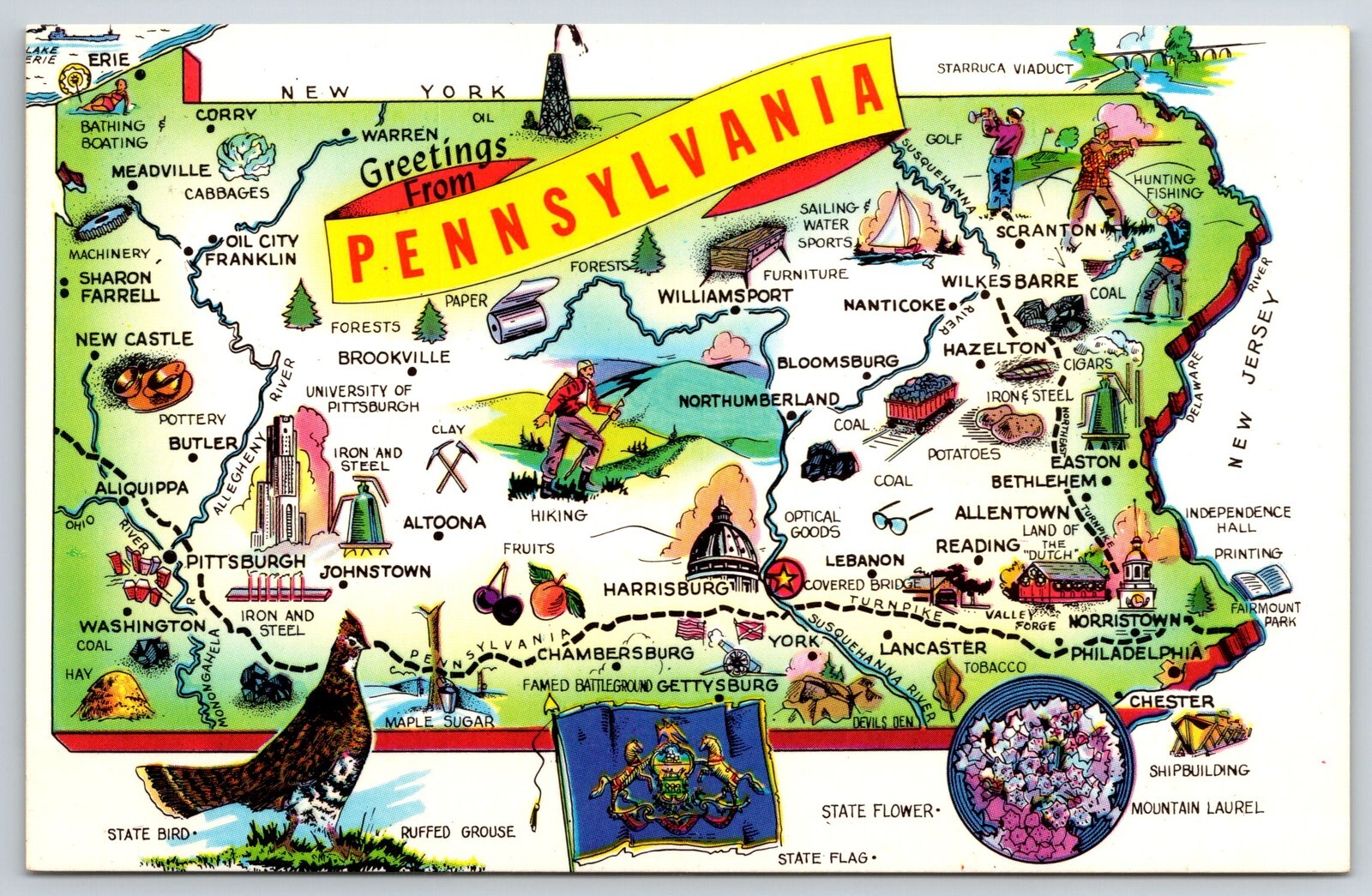 State Maps~Greetings From Pennsylvania~Brookville~Corry~Reading~Vintage Postcard