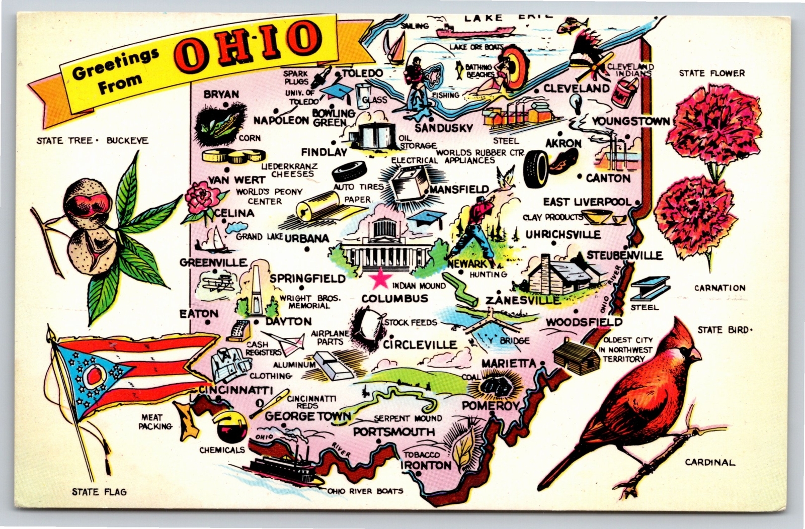 State Maps~State Flag Bird Flower Tree & Map of Ohio~Vintage Postcard