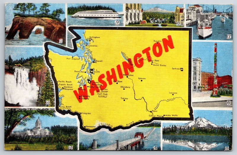 State Map~Washington Multi-View~Tacoma~Republic~Lacrosse~Pasco~Vintage Postcard