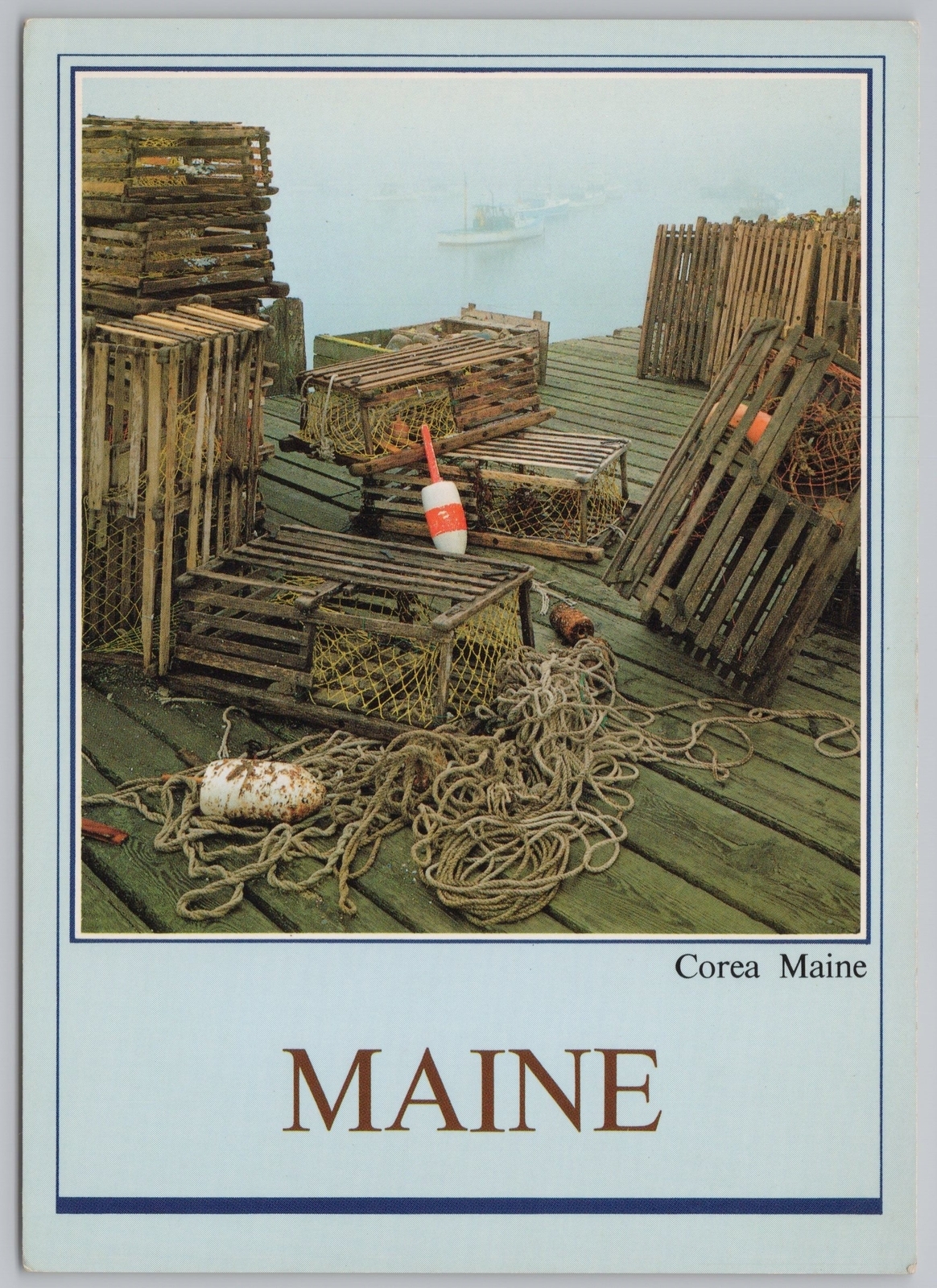 State View~Corea Maine~Foggy Lobster Traps On Dock~Boats~Continental Postcard