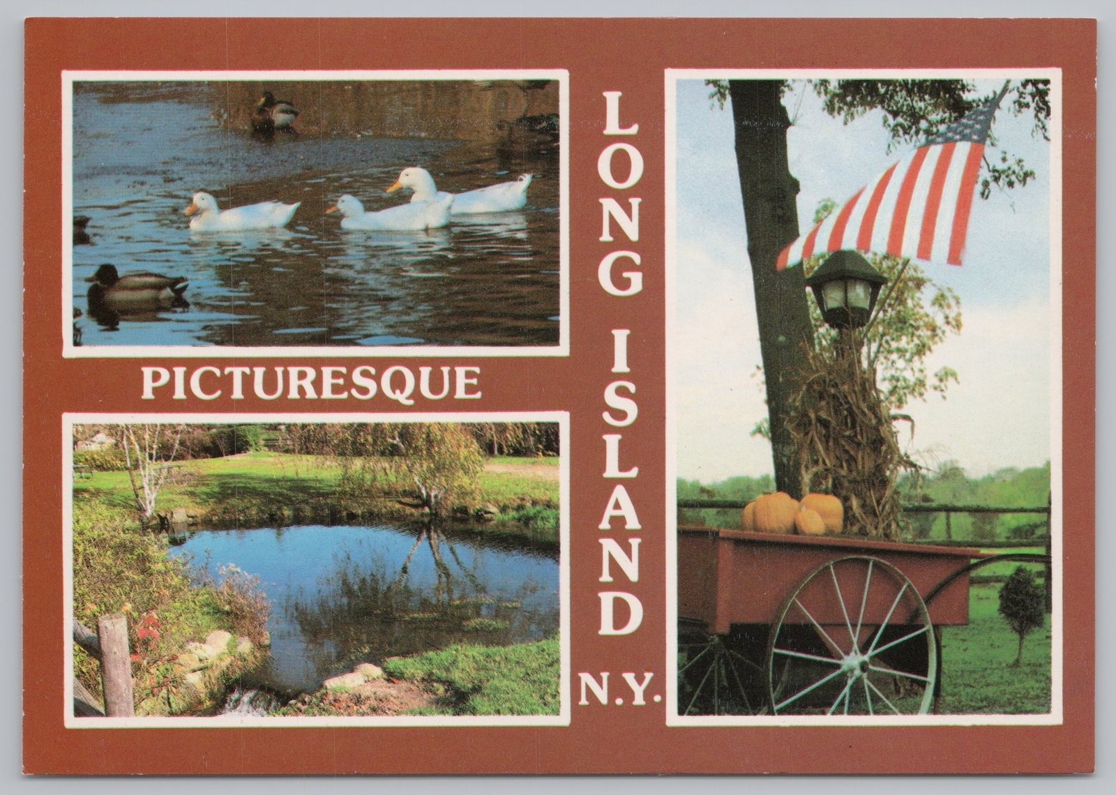 State View~Long Island NY~3 Views~Ducks~Pond~Pumpkins~Flag~Continental Postcard