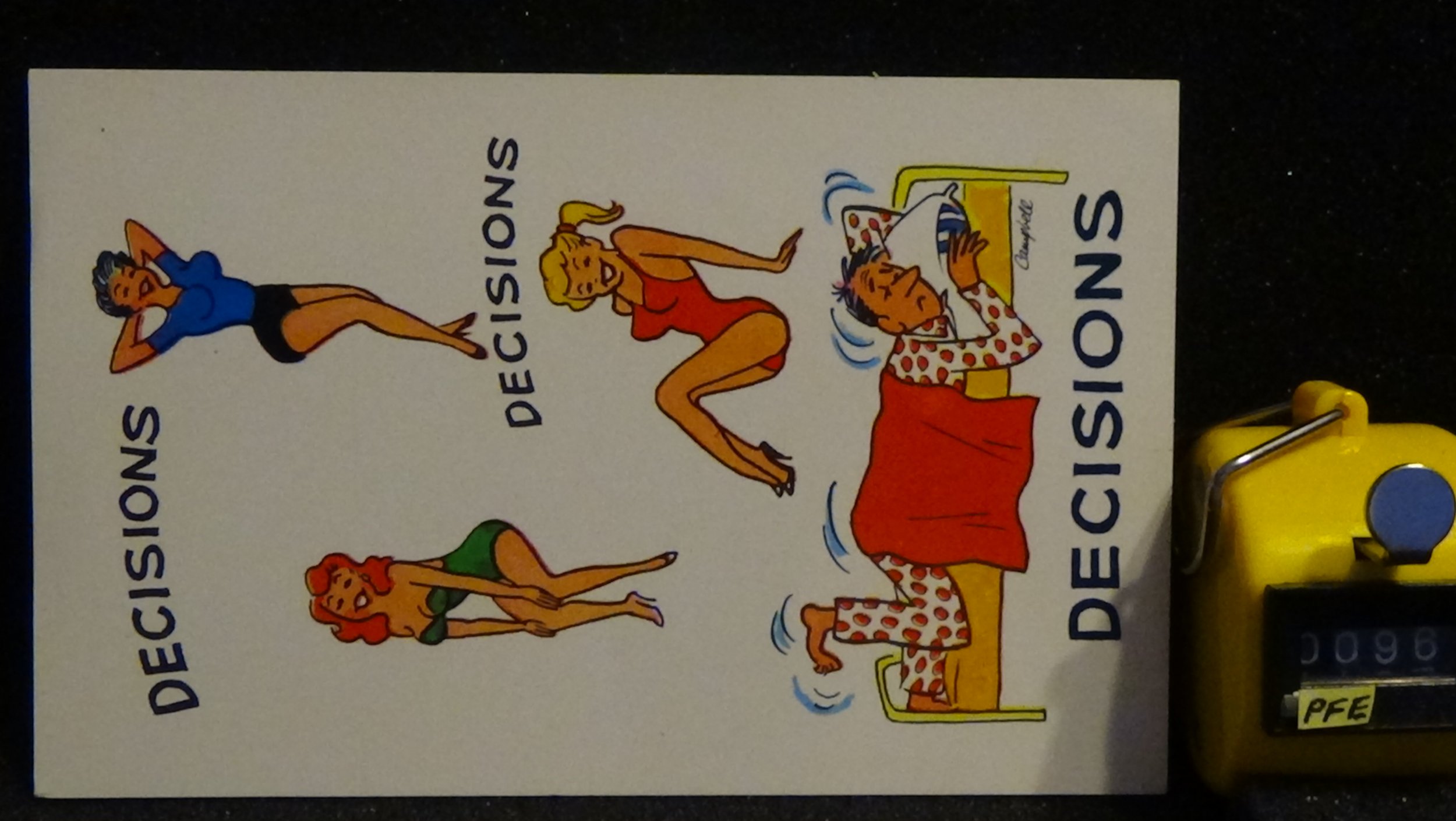 STD Decisions Decisions Decisions Humour Postcard Partial fold indentation along top of card. another indentation at green bikini bottom maybe from writing on something on top of the card
