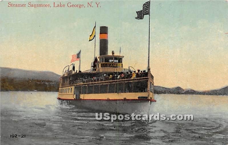 Steamer Sagamore - Lake George, New York Postcard - Writing on back Grade: 1 Size: R - Regular size: Approx 3 1/2 X 5 1/2 inch (9 cm X 14 cm) Grading Scale: Grade 1 = Perfect corners Grade 2 = Very Minimal cor ... Read More