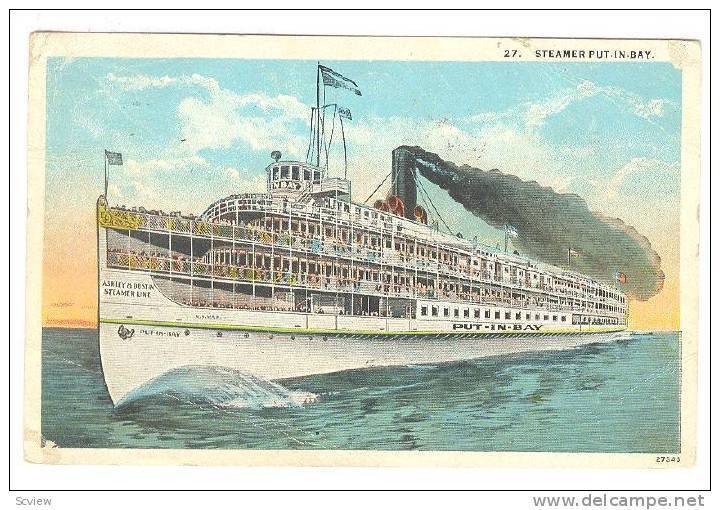 Steamer/Ship Put-In-Bay, PU-1928 :: Antique (Vintage) Original Postcard, Standard Size (3.5 by 5.5), Litho, VG+, CW, Stamp Removed, WOB.