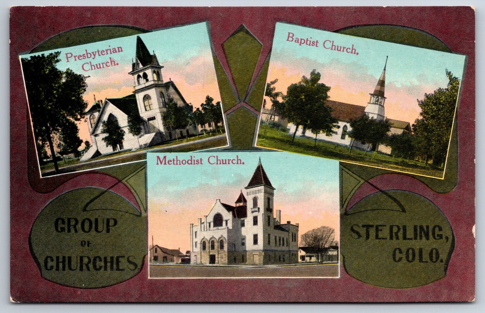 Sterling Colorado~Presbyterian-Baptist-Methodist Churches~c1910 Art Nouveau PC