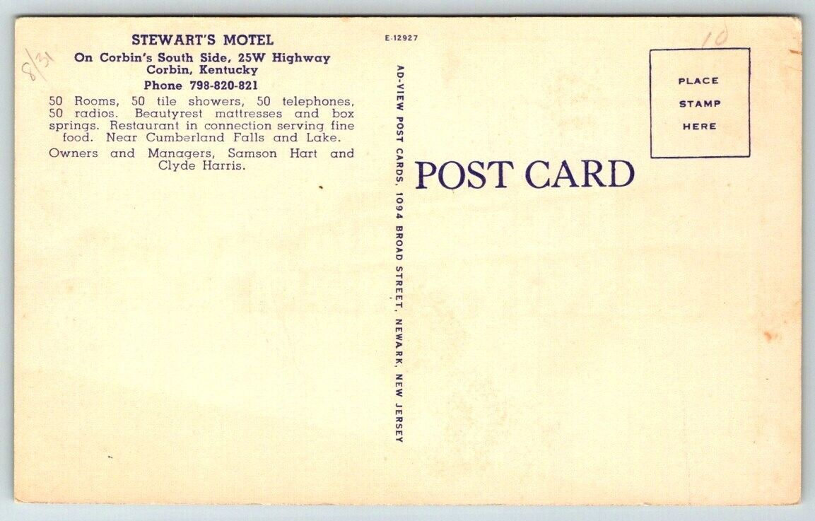 Stewart's Motel & Restaurant Corbin Kentucky Postcard