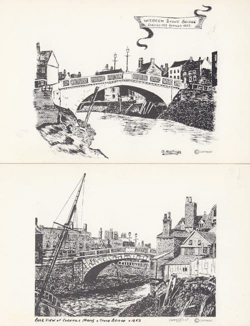 news86 A rare 1980s postcard pairing of cards of a local artists drawings of Stone Bridge in Wisbech as it was years ago beautifully captured in this locally produced postcard set unused graded vg+ condition