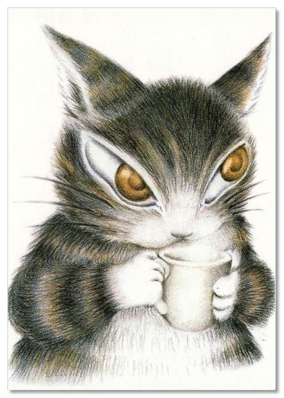 Strange CAT with Tea Coffee Cup by Wachifield Russian Modern Postcard