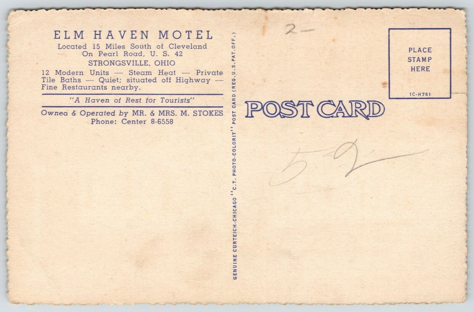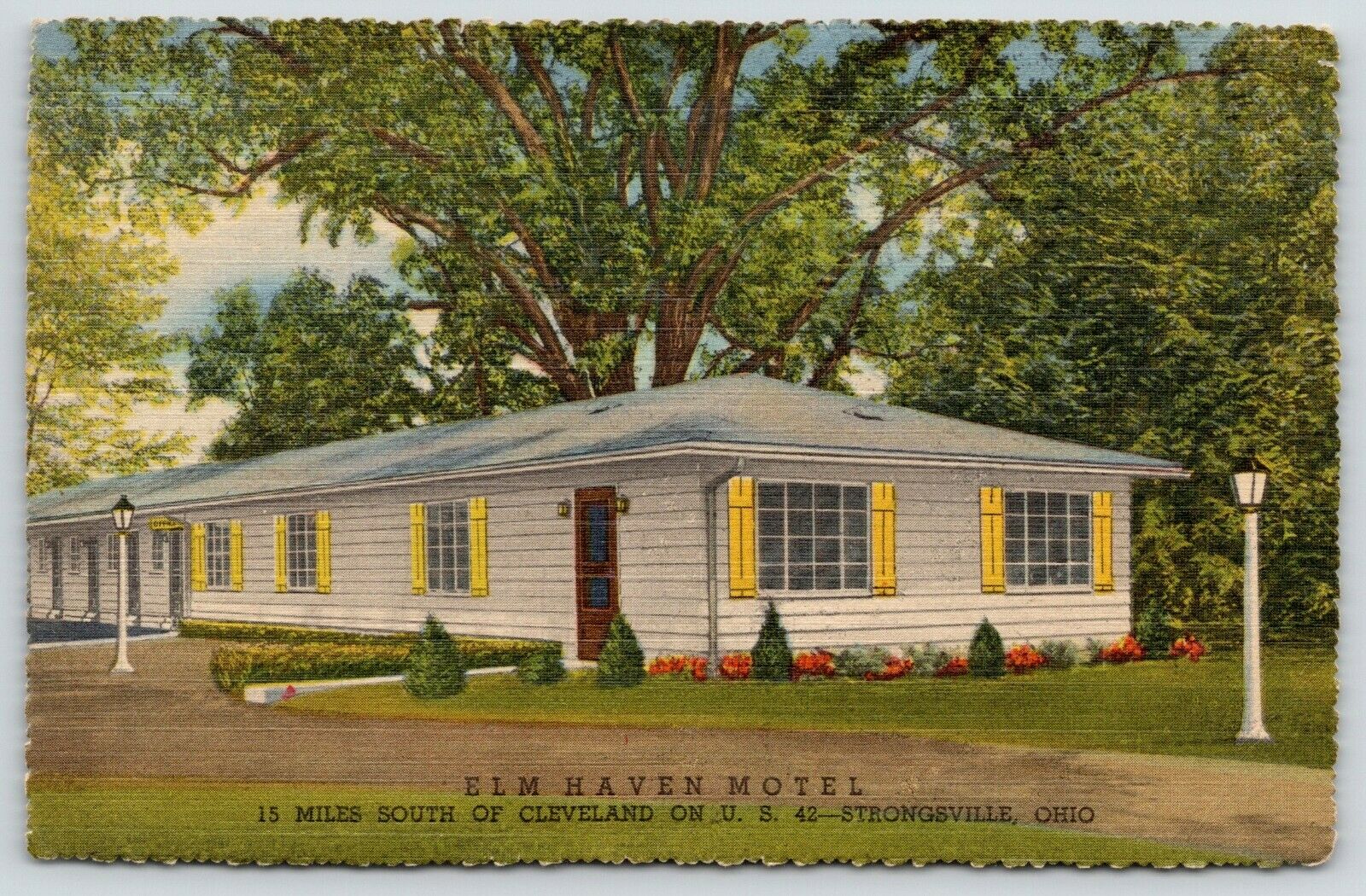 Strongsville Ohio~Elm Haven Motel~Yellow Shutters~Shaded by Trees~1940s Postcard