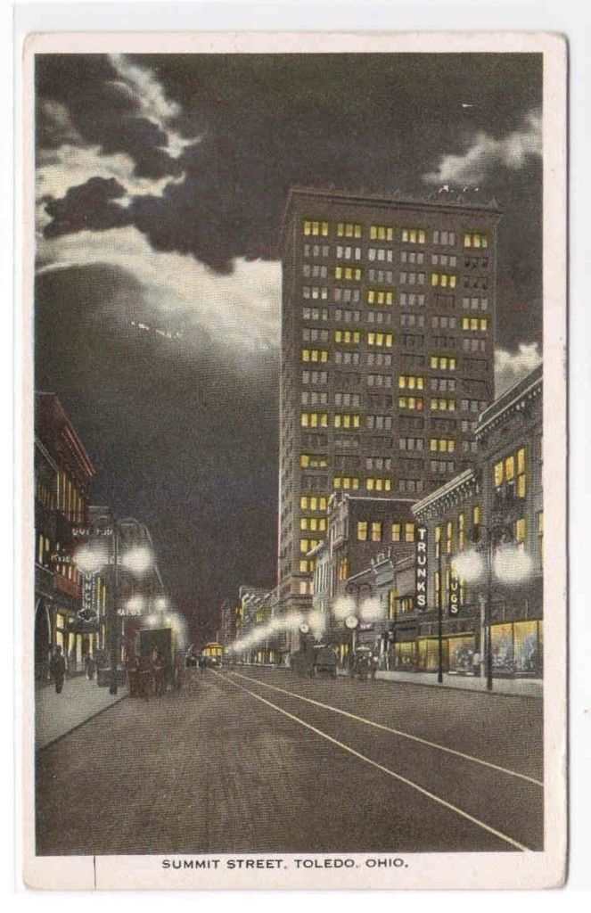 Description: Summit Street at Night Toledo Ohio 1916 postcard Type: white border postcard. Condition: excellent, light corner wear. Any hatched effect on pic is scanner effect, not on postcard. Postal Use: ... Read More