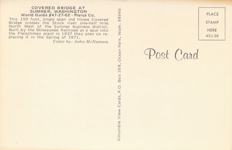 Sumner, Washington - Milwaukee Railroad Covered Bridge. Standard sized chrome card. Columbia View Cards of Ocean Park WA. Very good condition.