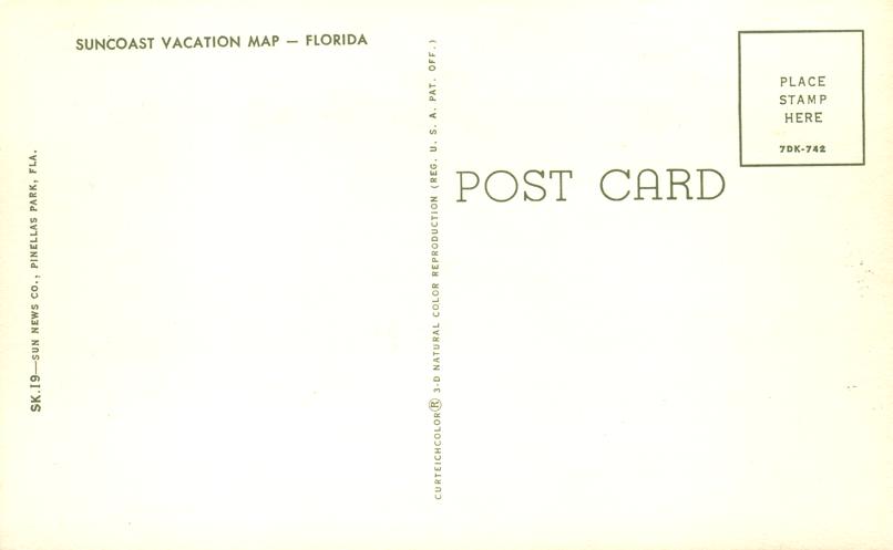 Suncoast of Florida Vacation Map. Standard sized chrome card. The Curt-Teich Dating Guide assigns 7DK-742 to 1967. Very good condition.